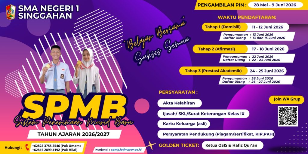 SINGGAHAN – SMAN 1 Singgahan secara resmi membuka Sistem Penerimaan Murid Baru (SPMB) Tahun Pelajaran 2026/2027. Mengusung motto “Belajar Bersama, Sukses Semua”, kami mengundang lulusan SMP/MTs sederajat untuk bergabung di sekolahan kami yang asri dan penuh prestasi. Kami percaya bahwa setiap anak memiliki keunikan dan ruang untuk berkembang, sehingga SMAN 1 Singgahan hadir sebagai wadah […]