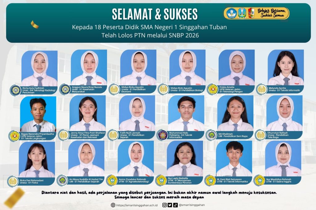 SINGGAHAN – Keluarga besar SMA Negeri 1 Singgahan kembali mengukir catatan membanggakan di kancah nasional. Sebanyak 18 peserta didik terbaik kami dinyatakan lolos Seleksi Nasional Berdasarkan Prestasi (SNBP) tahun 2026 dan berhasil diterima di berbagai Perguruan Tinggi Negeri (PTN) favorit. Pencapaian ini merupakan manifestasi dari kerja keras siswa, bimbingan intensif para guru, serta dukungan penuh dari orang tua. Berikut adalah daftar nama siswa beserta PTN dan program studi yang berhasil ditembus: